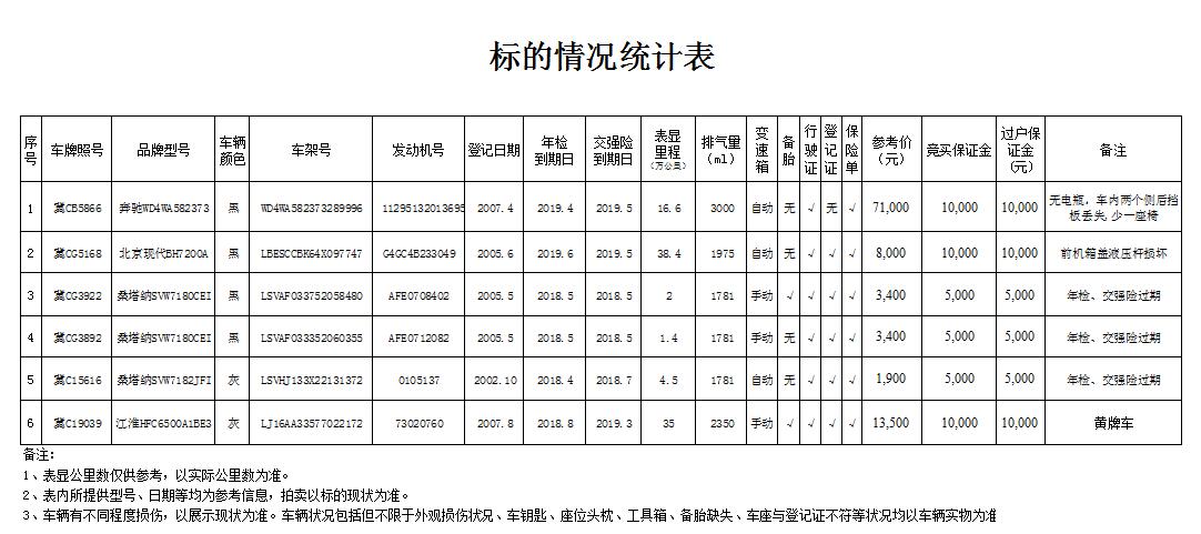 受有關(guān)部門委托,我公司定于2018年8月28日上午9:30時通過中國拍賣行業(yè)協(xié)會網(wǎng)絡(luò)拍賣平臺(http://paimai.caa123.org.cn)對“秦皇島經(jīng)濟(jì)技術(shù)開發(fā)區(qū)機(jī)關(guān)公務(wù)用車一批”進(jìn)行公開拍賣 。 展示時間:8月22日- 23日 展示地點:標(biāo)的所在地 咨詢電話:0335-8503399 13785070453(劉女士) 15903359799(李先生) 公司地址:秦皇島市海港區(qū)河北大街西段61號如意山海酒店2樓 公司網(wǎng)址:http://m.3dao.com.cn 注明:本次拍賣會采取網(wǎng)絡(luò)競價的方式。有意競買者請于2018年8月27日12時前攜帶相關(guān)證件到我公司交付保證金辦理競買手續(xù),并按要求辦理其他相關(guān)事宜,以支票或匯票形式交付保證金的,須全部款項入賬后方可辦理。